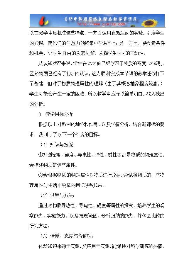 从认知状况来说,学生在此之前已经学习了物质的密度,对鉴别、区分物质已经有了初步的认识,这为顺利完成本节课的教学任务打下了基础,但对于物质物理属性的理解(由于其概念抽象程度较高,)学生可能会产生一定的困难,所以教学中应予以简单明白,深入浅出的分析。