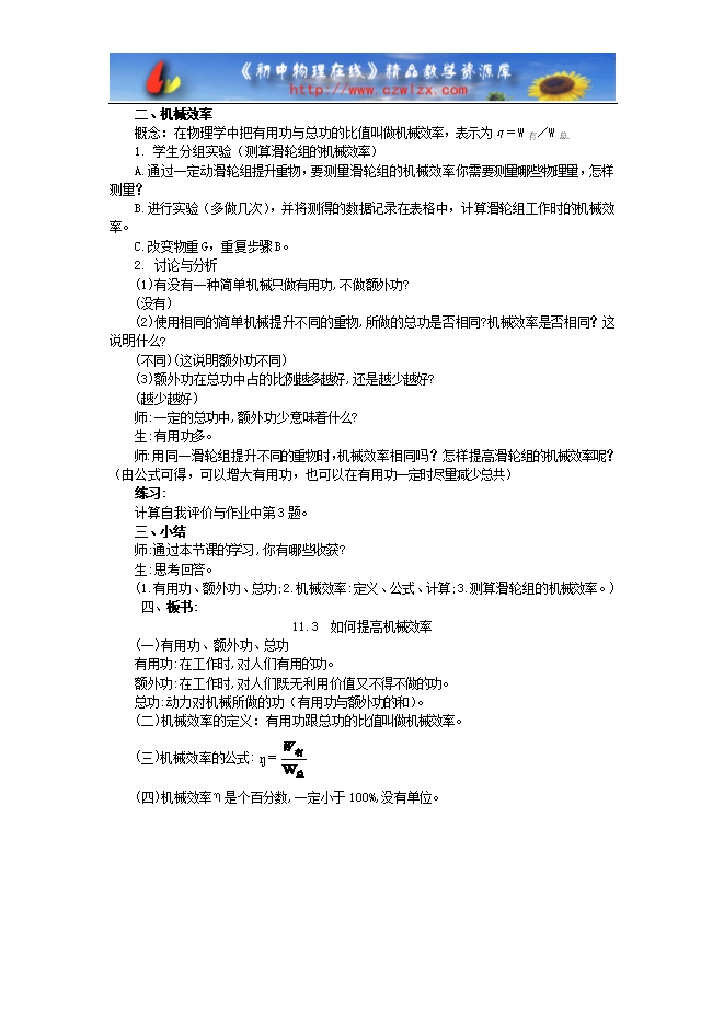 关注生产、生活中各种机械的机械效率,具有用机械效率来评价机械的意识。通过探究活动,进行充分的交流与合作,培养学生严谨求实的科学态度和团结协作的科学精神
