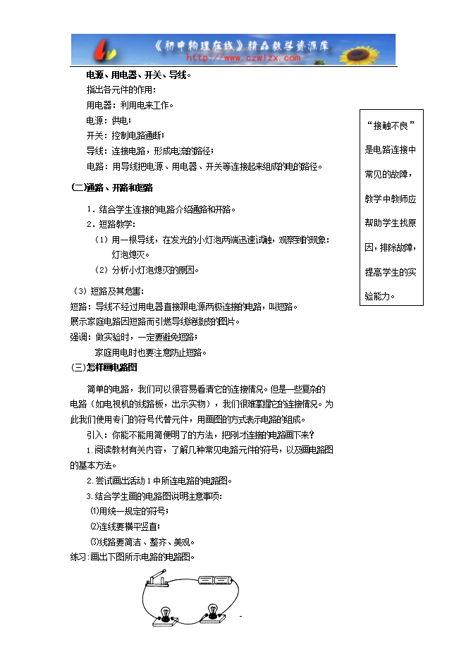 本节教学要重视学生实验,通过“活动”让学生对电路获得足够的感性认识,在此基础上学习电路的基本知识。