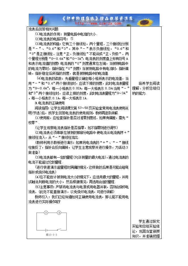 阅读指导:让学生阅读课文第57~58页实验室常用电流表使用说明(节选)后,找学生回答电流表的使用规则,教师再逐条讲解.