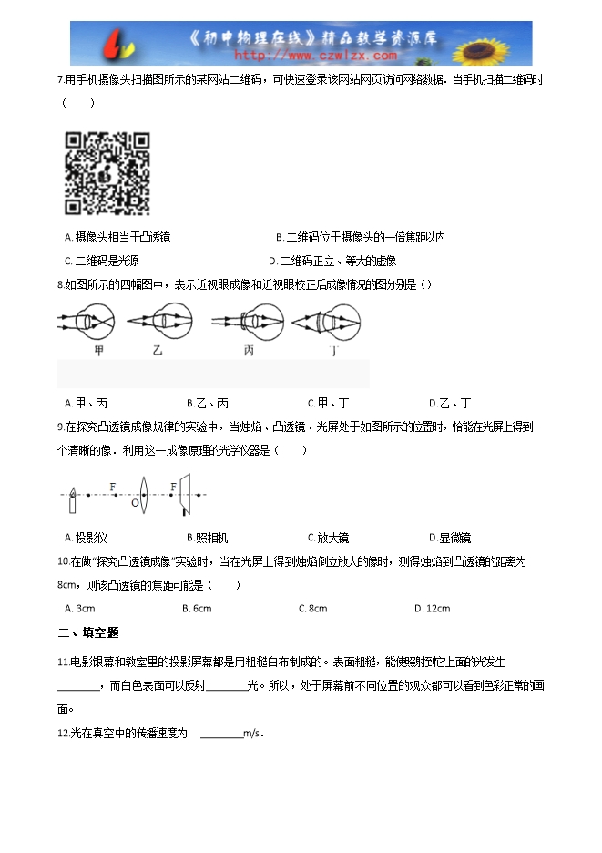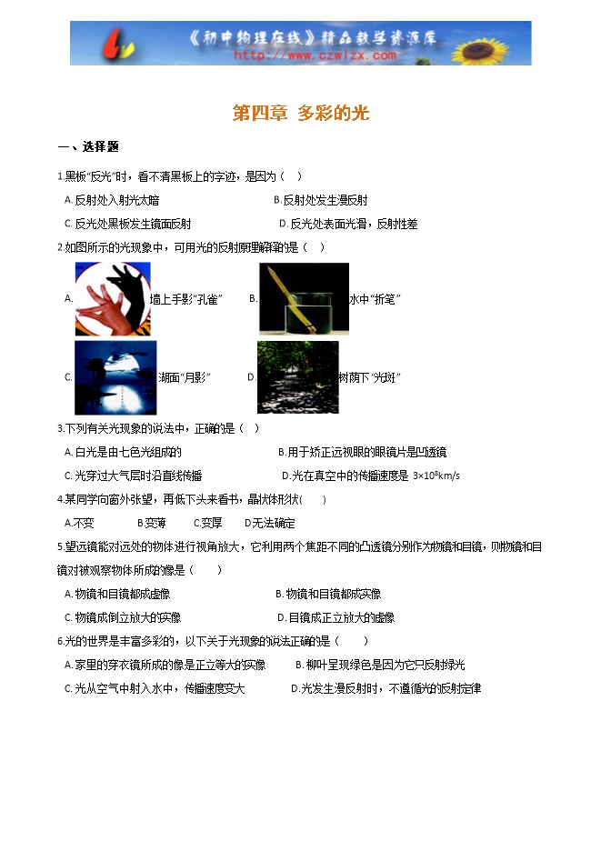 【内容简介】4.某同学向窗外张望,再低下头来看书,晶状体形状( ) A.不变 B.变薄 C.变厚 D.无法确定5.望远镜能对远处的物体进行视角放大,它利用两个焦距不同的凸透镜分别作为物镜和目镜,则物镜和目镜对被观察物体所成的像是( ) A. 物镜和目镜都成虚像 B. 物镜和目镜都成实像 C. 物镜成倒立放大的实像 D. 目镜成正立放大的虚像6.光的世界是丰富多彩的,以下关于光现象的说法正确的是( ) A. 家里的穿衣镜所成的像是正立等大的实像 B. 柳叶呈现绿色是因为它只反射绿光 C. 光从空气中射入水中,传播速度变大 D. 光发生漫反射时,不遵循光的反射定律
