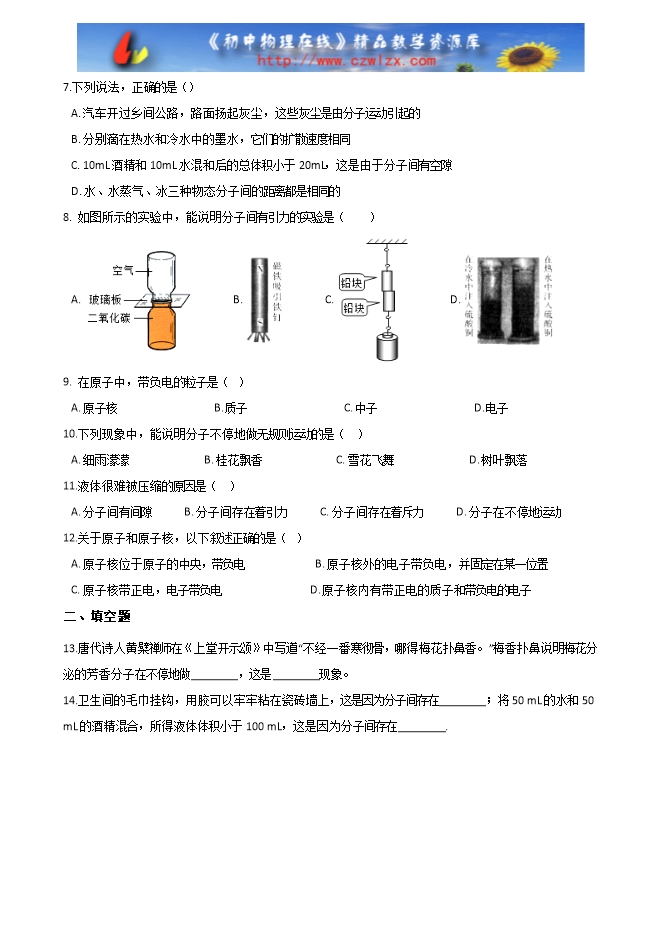 【内容简介】一、选择题1. 对下列现象的解释,正确的是( ) A. 打开香水瓶盖后,能闻到香味,说明分子在永不停息地做无规则运动 B. 封闭在容器内的液体很难被压缩,说明分子间有引力 C. 用手捏海绵,海绵的体积变小了,说明分子间有间隙 D. 铅笔笔芯用了一段时间后会变短,说明分子间有斥力2.以下关于分子热运动的说法中正确的是( ) A. 水流速度越大,水分子的热运动越剧烈 B. 水凝结成冰后,水分子的热运动停止 C. 水的温度越高,水分子的热运动越剧烈 D. 水的温度升高,每一个水分子的运动的速度都会增大3.1911年,卢瑟福建立了原子的核式结构模型.下列关于这个模型的说法中正确的是( ) A. 原子核位于原子的中心 B. 原子核带负电 C. 电子静止在原子核周围 D. 原子核占据了原子内大部分空间4.如图所示,将肉片直接放入热油锅里爆炒,会将肉炒焦或炒糊,大大失去鲜味。厨师预先将适量的淀粉拌入肉片中,再放到热油锅里爆炒,炒出的肉片既鲜嫩味美又营养丰富,对此现象说法不正确的是()