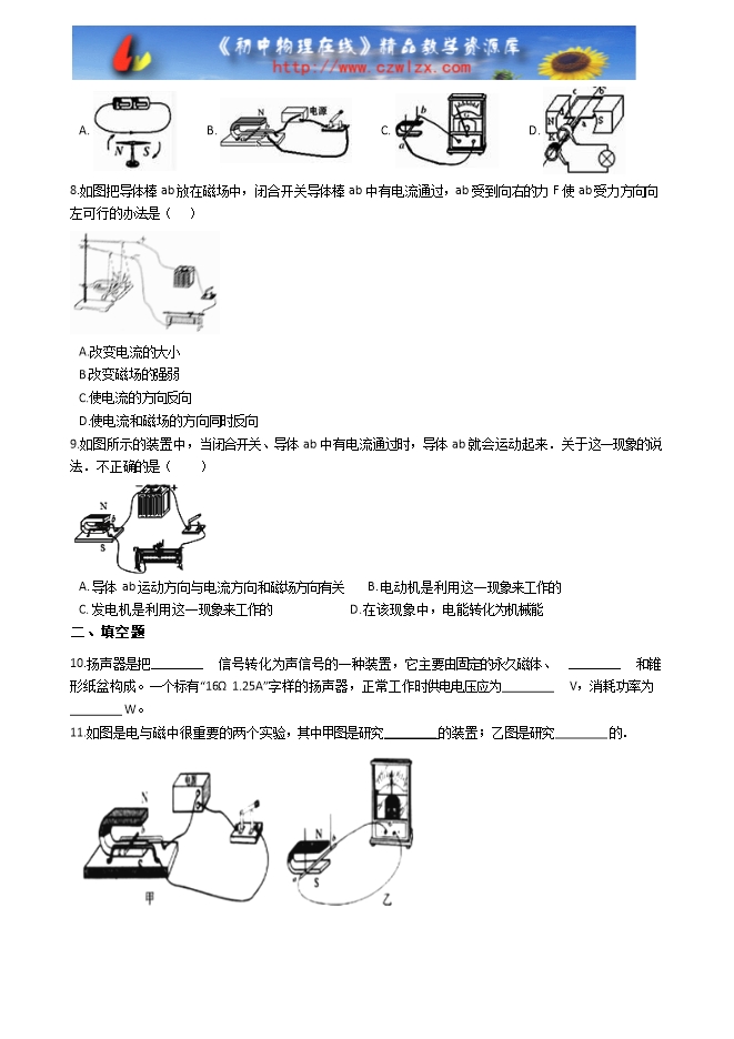 2019-2020学年北师大版九年级物理 14.5磁场对通电导线的作用 同步测试题及解析