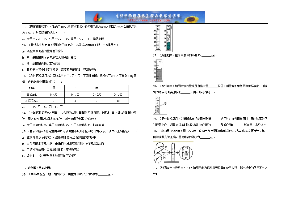 【内容简介】一.选择题(共15小题)1.(华安县月考)甲乙两个量筒的分度值分别是1cm3和2cm3,用它们来测量等质量煤油的体积,如图所示。某同学的读数分别是13.8cm3和13.9cm3.则下列分析正确的是( )A.甲量筒的分度值是1cm3B.两次读数不同是因为煤油体积不同C.两量筒的分度值不同,不影响误差大小D.乙量筒的分度值小,因此精确度更高2.(临沂模拟)如图所示,其中读数正确的是( )A.物体的长度为3.5cm B.物体的重力为2.8NC.液体的体积为60mL D.秒表的示数为30min3.(临西县期末)要求较准确地测出80 cm3的酒精,下列四种规格的量筒中,最合适的是( )A.量程50mL,最小刻度5mL B.量程50mL,最小刻度2mLC.量程100mL,最小刻度10mL D.量程100mL,最小刻度5mL4.(中考春•丰县校级月考)只有量杯,没有天平,能否取得100g的酒精( )A.能 B.不能C.只能大致地得出 D.无法确定5.(惠山区校级月考)要想一次量出密度为0.8×103kg/m3、质量为100g的煤油的体积,有下面四种量筒可供选用,比较合适的是( )A.量程为250 mL,分度值为5 mLB.量程为50 mL,分度值为1 mLC.量程为100 mL,分度值为2 mLD.量程为1000 mL,分度值为10 mL6.(儋州期末)物理实验室中常用的测量液体体积的仪器是( )A.天平 B.刻度尺 C.量筒 D.温度计7.(信宜市期末)下面量筒读数时的几种做法。正确的是( )A. B. C. D.8.(上城区期末)某同学欲从盛有液体的量筒中倒出部分液体,量筒放平后,仰视液面读数为82毫升,倒出部分液体后,俯视液面读数为52毫升,则该学生实际倒出液体的体积为( )A.大于30毫升 B.等于30毫升 C.小于30毫升 D.无法确定9.(杭州期末)用量筒量取液体,仰视量筒内液体的凹液面最低处,读数为25毫升;倒出部分液体后,俯视凹液面的最低处,读数为19毫升,则该学生实际倒出的溶液体积( )A.大于6毫升 B.小于6毫升 C.等于6毫升 D.无法确定范围10.(嘉兴期中)某学生用量筒量取液体时,量筒放平稳后仰视液面读得数值为19毫升,倾倒部分液体后,又俯视液面,数值为10毫升。则该学生实际倾倒的液体体积是( )A.9毫升 B.小于9毫升C.大于9毫升 D.操作错误无法判断