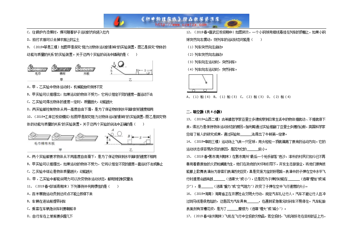 【内容简介】 一.选择题(共12小题)1.(2019•青岛)“一切物体在没有受到力的作用时,总保持静止状态或匀速直线运动状态。”总结概括出这重要规律的科学家是( )A.亚里士多德 B.伽利略 C.牛顿 D.托里拆利2.(2019•云南)在可靠实验事实的基础上,通过假想在理想状态下,经过分析、综合等符合逻辑的科学推理得出规律,是一种重要的研究方法。下列规律采用此方法得出的是( )A.能量守恒定律 B.杠杆平衡原理C.牛顿第一定律 D.串、并联电路中电压的规律3.(2019•江苏一模)在汽车中悬线上挂一个小球,当汽车运动时,悬线将与竖直方向成某一固定角度,如图所示,若在汽车底板上还有一个跟其相对静止的物体M,则关于汽车的运动情况和物体M的受力情况正确的是( )