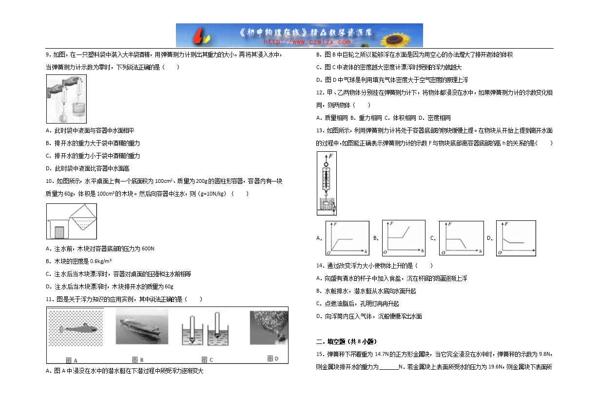 【内容简介】一.选择题(共14小题)1.下列情景中没有受到浮力的物体是( )A.遨游的“天空一号” B.航行的“辽宁号”C.下潜的“蛟龙”号 D.上升的热气球2.关于物体所受的浮力,下列说法中正确的是( )A.空气中的物体不受浮力作用B.沉在水底的铁球不受浮力作用C.浮力是物体对液体施加的力D.浮力是液体或气体对物体压力的合力3.下列物体中不受浮力的是( )A.大海中航行的轮船 B.空中上升的气球C.太空中运行的宇宙飞船 D.水中下沉的石块4.如图所示情景中没有受到浮力的物体是( )