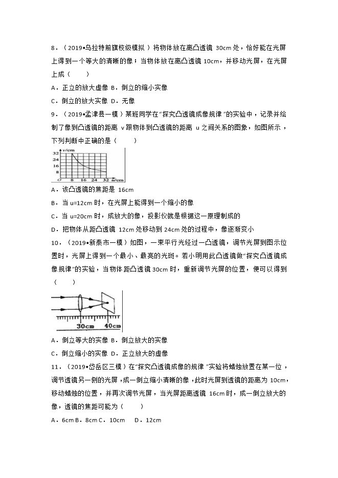 【内容简介】一.选择题(共12小题)1.(2019•自贡)关于凸透镜的应用,下列说法正确的是( )A.凸透镜成的像都是实像B.照相时,景物在镜头二倍焦距以内C.投影仪中的投影片放在镜头二倍焦距以外D.远视眼镜利用了凸透镜对光的会聚作用2.(2019•咸宁)一凸透镜的焦距为15cm,将点燃的蜡烛从离凸透镜40cm处沿主光轴移到20cm处的过程中,像的大小和像距的变化情况是( )A.像变大,像距变大 B.像变小,像距变小C.像变大,像距变小 D.像变小,像距变大3.(2019•临沂)在探究凸透镜成像规律的实验中,蜡烛、凸透镜和光屏的位置如图所示,烛焰在光屏上恰好成一清晰等大的实像,下列说法正确的是( )