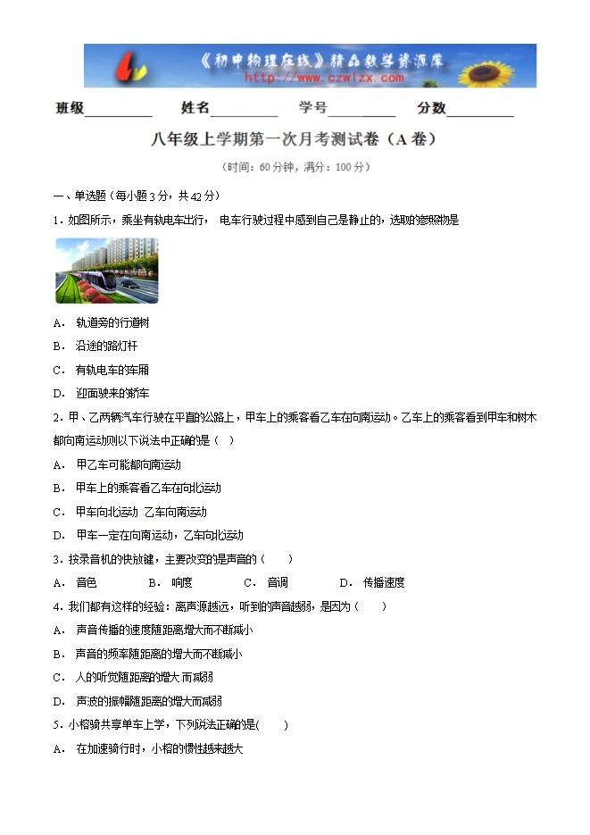 八年级物理同步单元双基双测“AB”卷:月考(一)(A卷和B卷,4份打包)