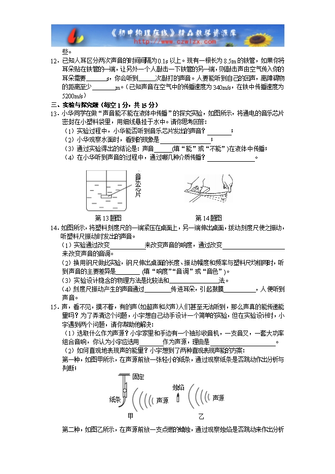 【内容简介】一、选择题(每小题只有一个选项符合题意,每小题3分,共21分)1.如图所示,把正在响铃的闹钟放在玻璃罩内,逐渐抽出罩内的空气,听到声音逐渐变小,再让空气逐渐进入罩内,听到声音又逐渐变大,这个现象说明 ( )A.声音的传播需要介质B.声音的传播不需要介质C.空气阻断了声音的传播D.玻璃罩阻断了声音的传播2.如图所示同学们自制一件小乐器,在8个相同的透明玻璃瓶中装有不同高度的水,用同样大小的力敲击8个玻璃瓶,会发出不同的声音,这“不同的声音”主要是指声音的