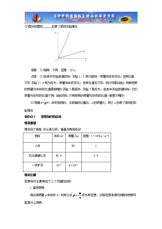 【内容简介】教材全解 1.物质的质量和体积的关系.同种物质的质量与体积的比值一定即同种物质的质量和体积具有成正比的关系不同物质质量与体积的比值-般不同,这反映了不同物质的不同属性物理学中用密度来表示这种特性. 2.密度 某种物质组成的物体的质量与它的体积之比叫做这种物质的密度,其公式.密度的单位是千克每立方米(kg/m3)或克每立方厘米(g/cm3),密度的单位是组合单位. 3.密度是物质的一种特性,是单位体积的物质的质量,由于物质大都具有热胀冷缩的性质,物质的密度也会随物质温度的变化而变化;但由于温度对体积的影响并不大,密度随温度的变化也不太大.知识拓展 探究同种物质的质量和体积的关系应注意的问题 (1)为了得到普遍性结论,使结论更具有说服力,选取的物质种类要多一些,且要进行多次测量; (2)在分析、比较实验数据时,要运用控制变量法,即相同的质量比较体积、相同体积比较质量;或计算质量与体积的比值进行分析与比较; (3)也可以应用图像法来分析数据,质量与体积的关系图像是通过原点的一条直线。