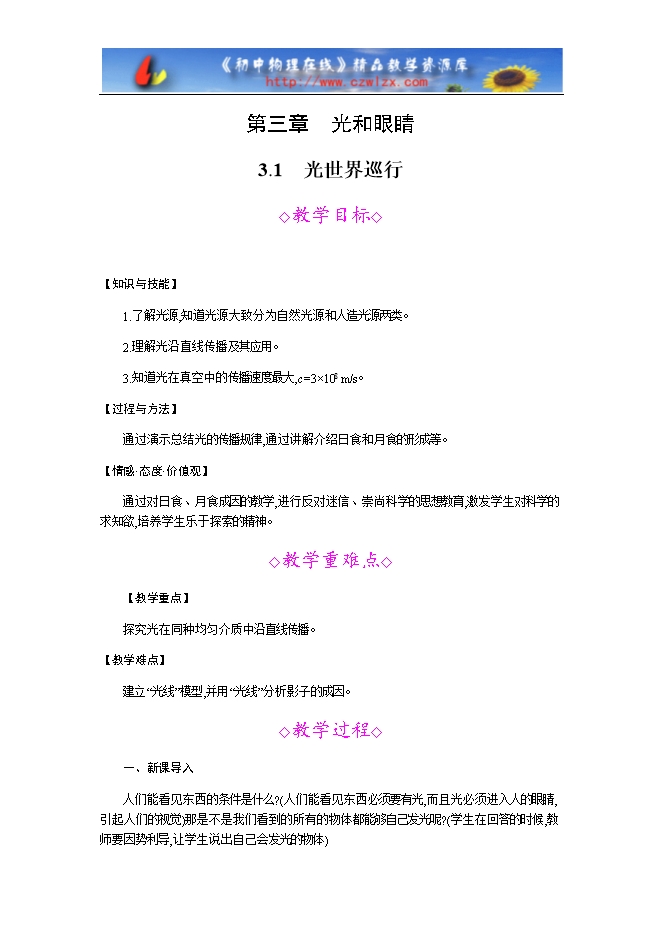 【内容简介】第三章 光和眼睛3.1 光世界巡行◇教学目标◇ 【知识与技能】1.了解光源,知道光源大致分为自然光源和人造光源两类。2.理解光沿直线传播及其应用。3.知道光在真空中的传播速度最大,c=3×108 m/s。【过程与方法】通过演示总结光的传播规律,通过讲解介绍日食和月食的形成等。【情感·态度·价值观】通过对日食、月食成因的教学,进行反对迷信、崇尚科学的思想教育,激发学生对科学的求知欲,培养学生乐于探索的精神。◇教学重难点◇【教学重点】探究光在同种均匀介质中沿直线传播。【教学难点】建立“光线”模型,并用“光线”分析影子的成因。◇教学过程◇一、新课导入人们能看见东西的条件是什么?(人们能看见东西必须要有光,而且光必须进入人的眼睛,引起人们的视觉)那是不是我们看到的所有的物体都能够自己发光呢?(学生在回答的时候,教师要因势利导,让学生说出自己会发光的物体)二、教学步骤探究点1 光能为我们做些什么[阅读课本]P46“光能为我们做些什么”[思考]我们生活在光的世界里,光每时每刻都在为我们服务,引导学生讨论:光能为我们做些什么?[提示]在学生讨论的基础上,得出光的作用。并让学生设想:假如没有光,世界会变成什么样子呢?从而体会到光的重要性。探究点2 光是怎样传播的[阅读课本]P47~48“光是怎样传播的”[小组讨论]生活、生产中有各种各样的光源。你能否归纳出它们的共同特征?[提示]光源可分为自然光源和人造光源。自然光源包括太阳、萤火虫、灯笼鱼、斧头鱼等;人造光源包括点燃的蜡烛、打开的电灯等。[归纳提升]自行发光的物体叫做光源。