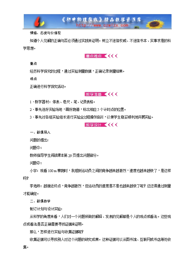 【内容简介】本节内容为探究物体运动速度的变化,是学生第一次进行科学探究活动。其目的是使学生初步经历科学探究过程,学会通过实验收集信息的一些基本方法。课程标准要求学生能将物体运动的时间或路程分解为若干段,测量不同阶段物体运动的速度;通过实验测量数据,会正确记录数据;初步经历科学探究过程,树立不迷信权威,不迷信书本,以及实践是检验真理的唯一标准的思想。教材首先通过具体情景引导学生了解科学探究的第一个环节——提出问题。然后是引导学生如何从科学的角度去验证个人的观点或看法是否正确,引出科学探究的另一个环节——进行实验与收集证据,教师应强调收集证据时要操作规范、实事求是,养成严谨客观的科学态度。最后提出了三个具体问题让学生有选择地去进行探究活动。由于科学探究的环节较多,不可能让学生一次探究就全部掌握,所以教材只要求学生完成核心环节:提出问题,猜想与假设,实验方案,探究结论。教师教学中应注意引导学生如何提出问题,怎样进行实验收集证据,初步学会分析从实验中获得的数据并得出结论的方法。由于学生是第一次进行科学探究活动,往往不知如何下手,该做哪些事情,教师应及时给予指导。探究活动最好以小组为单位开展,提倡学生根据前面所学内容,自己设计实验方案和收集实验数据的表格,教师检查学生的实验方案是否可行,是否安全,再让学生进行探究性活动。