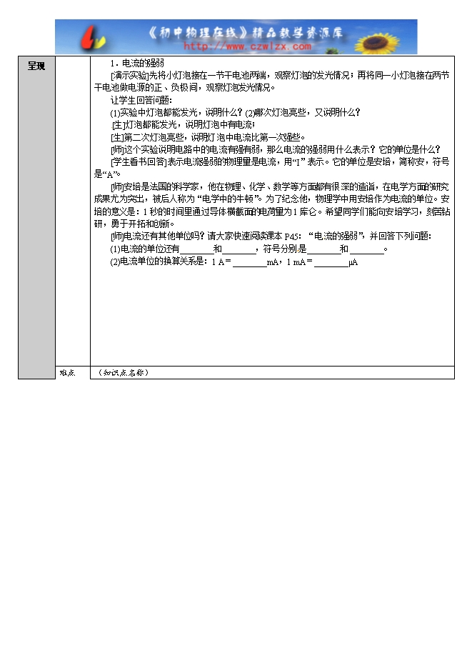【内容简介】课标要求1.知道电流的强弱及单位;[来源:Zxxk.Com]2.会正确使用电流表,测出电路中的电流。学情分析电流表和电流的测量,和生活中的经验脱节,所以重点在于让学生能直观感受到,动手操作教学目标通过演示实验动手操作,学会使用电流表,感受电路中电流的强弱。情感、态度与价值观通过实验培养严谨的科学态度与协作精神。复习导入(视需要)前面我们学习过电流的产生和电流的方向,那么电流有大小吗?怎样测量电流的大小?