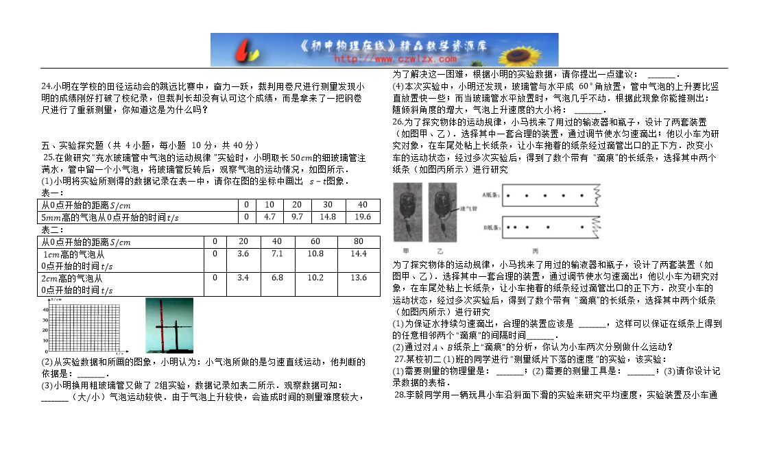 【内容简介】一、选择题(共 14 小题,每小题 2 分,共 28 分) 1.下列数据最接近实际情况的是()A.人的拇指宽约为 B.课桌的高度约为C.人步行的速度约为D.正常人次脉搏的时间约为 2.下列现象中,不是机械运动的是()A.骏马奔驰B.流萤飞舞C.秧苗长高D.水流向东 3.某物体在第一、第二分钟内共前进了,第三分钟静止不动,第四分钟前进了,则它在内的平均速度为()A.B.C.D. 4.某物理兴趣小组为估算闪电发生位置到他们的距离,设计出用声速乘以时间的估算方案,为此,四位同学提出测量时间的方法,其中最合理的是()A.某次闪电时,记录刚刚看到闪电至雷声刚刚结束的时间B.某次闪电时,记录刚刚看到闪电至刚刚听到雷声的时间C.某次闪电时,按照选项、两种方法测量时间,计算它们的平均值D.按照选项的方法,测量三次闪电对应的时间,计算它们的平均值 5.小明去乘公园的过山车.过山车高速运动时,小明看到地面上的人和建筑物都在旋转,他选取的参照物是()A.过山车道B.建筑物C.地面上的树木D.过山车
