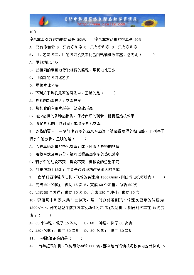 【内容简介】一.选择题(共12小题)1.古语道:“人要实,火要虚”。此话的意思是说做人要脚踏实地,才能事业有成:可燃物要架空一些,才能燃烧更旺。“火要虚”的目的是( )A.增大可燃物物的热值 B.降低可燃物的着火点C.能使可燃物完全燃烧 D.提高了可燃物的利用率2.木炭的热值为3.4×107J/kg,它表示1kg木炭( )A.具有3.4×107J的热量 B.具有3.4×107J的内能C.完全燃烧对外做功3.4×107J D.完全燃烧放出热量3.4×107J3.某校初三年级的学生参观了学校锅炉房后,提出了以下几种提高炉子效率的建议,其中不应采纳的是( )A.鼓风机向炉膛内吹风,把煤粒吹起来燃烧B.向炉内多加些煤,加大火力C.煤磨成粉,用空气吹进炉膛D.用各种办法增大受热面积4.下列关于热值的说法中,正确的是( )A.燃料燃烧时,用的燃料越多,这种燃料的热值越大B.燃料燃烧时,放出的热量越多,这种燃料的热值越大C.相同质量的不同燃料完全燃烧,放出热量较少的燃料,热值较大D.不同的燃料完全燃烧,放出相同热量时,所用燃料越少,这种燃料的热值越大