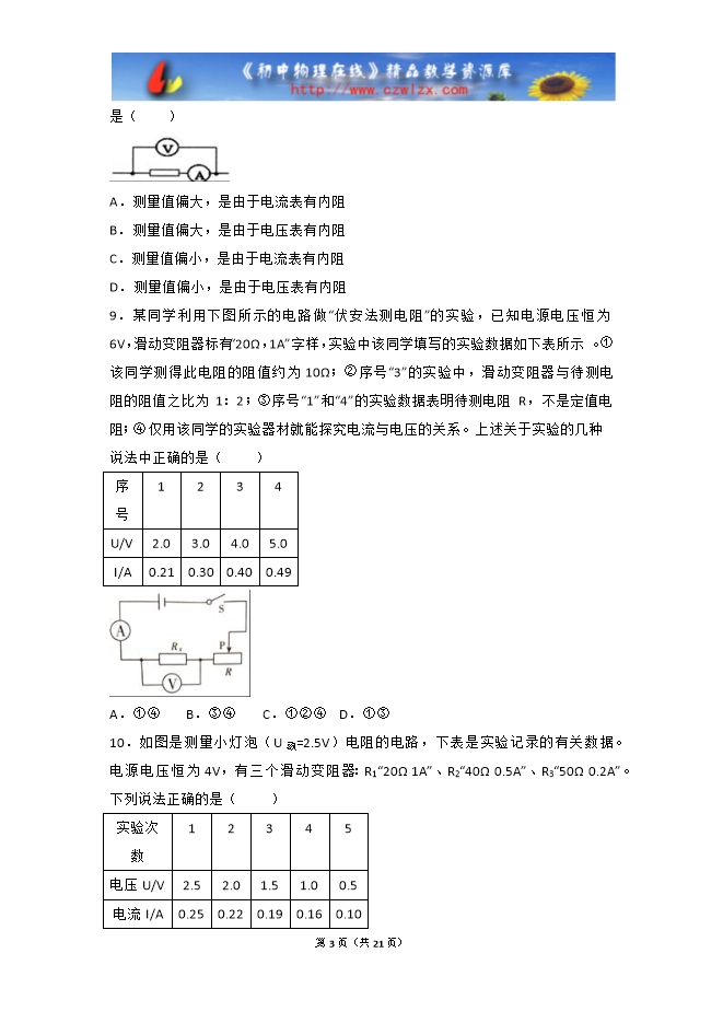 【内容简介】一.选择题(共15小题)1.实验室测导体电阻的方法叫( )A.欧姆法 B.电阻法 C.伏安法 D.以上都不是2.许多科学实验涉及操作上“先”与“后”的问题,若把“先”与“后”顺序颠倒,就会影响实验效果或导致事故的发生。下列描述的实验操作中“先”“后”顺序正确的是( )A.伏安法测电阻的实验中,连接电路时,先将滑片移到阻值最大处,闭合开关后,移动滑片减小阻值B.稀释浓硫酸时,先将浓硫酸倒入烧杯中,后将水沿着烧杯壁慢慢倒入浓硫酸中C.使用显微镜观察血涂片时,先调节细准焦螺旋,后调节粗准焦螺旋D.用氢气还原氧化铜时,先加热,后通入氢气3.用“伏安法测电阻”的实验中,小雪和晓彤分别选用定值电阻和小灯泡为测量对象,在处理实验数据时,分别画出了U﹣I的图象,如图甲、乙所示。对于图象的分析,以下说法错误的是( )