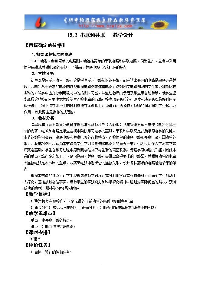 【内容简介】【目标确定的依据】1.相关课程标准的陈述3.4.3会看、会画简单的电路图。会连接简单的串联电路和并联电路。说出生产、生活中采用简单串联或并联电路的实例。了解串、并联电路电流和电压的特点。2.学情分析初中阶段只学习简单电路,这是学生学习电路知识的开始。能辨认出实际的电路是串联还是并联,会画出合乎要求的电路图以及根据电路图来连接电路,这对刚学电路知识的学生来说都是比较困难的。教学中应充分利用教材中的插图、习题,并通过教师的示范及学生亲自动手等,使学生逐步掌握这些技能。要注意教给学生连接电路的方法,提高演示实验的可见度。演示实验最好利用示教板进行,将平铺在讲台上的器材悬挂在示教板上,边讲解,边操作。教师的演示将对学生起示范作用,因此要注意操作的规范性。3. 教材分析《串联和并联》是义务教育课程标准实验教科书(人教版)八年级第五章《电流和电路》第三节的内容,电流和电路是学生在初中阶段学习电学的基础,串联和并联又是以后学习电学的关键。本节的教学内容有:串联电路和并联电路的连接特点、连接简单的串联电路和并联电路、画简单的串、并联电路图。我认为本节课是学生学习《电流和电路》的重要一节,也为以后深入学习其它知识奠定基础,学生在学习过程中感受到物理知识与生活的紧密联系,增强学习物理的兴趣。因此本课的重点、难点确定如下:正确识别串、并联电路,会画出合乎要求的电路图,并根据简单的电路图连接电路是本节课的重点,从实际电路中看出它的连接关系,设计各种要求的电路是这节课的难点。根据本节课的特点,让学生积极参与教学过程,充分利用实验室现有器材,让每个学生都动手去探究,直接接触物理事实,培养学生的实践能力和科学探究精神。通过对实际问题的解决,获得成功的喜悦,增强学习物理的激情。