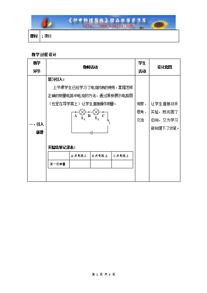 【内容简介】本节的内容是在学生初步了解电路和电流的概念及认识了串联电路和并联电路的特点、会正确使用电流表的基础上,通过教师提出问题,由学生进行科学的猜想、设计实验方案、动手实验收集数据、对数据进行分析讨论、交流评估的过程,使学生初步领会科学实验的方法。通过本节课的教学,学生应该学会应用电流表测量电流、会根据问题的提出设计实验,选择器材并进行实验,从而掌握串并联电路电流的规律。新课程标准只要求学生经历探究过程的各个环节,对探究结论的正确性不做评价。新教材更突出过程与方法、更加注重合作交流等新的学习方式。 学生已具备一定的动手实验能力和运用所学知识解决简单实际问题的能力,已基本能够运用观察、分析、归纳、比较等科学方法来探求新知识。学生在生活中经常接触到电流的信息,学生对电流的测量已有感性认识,有一定的知识储备。教学过程设计了许多与生活联系密切的事物及相关实验,可以由此引起学生探究的兴趣进入新课。