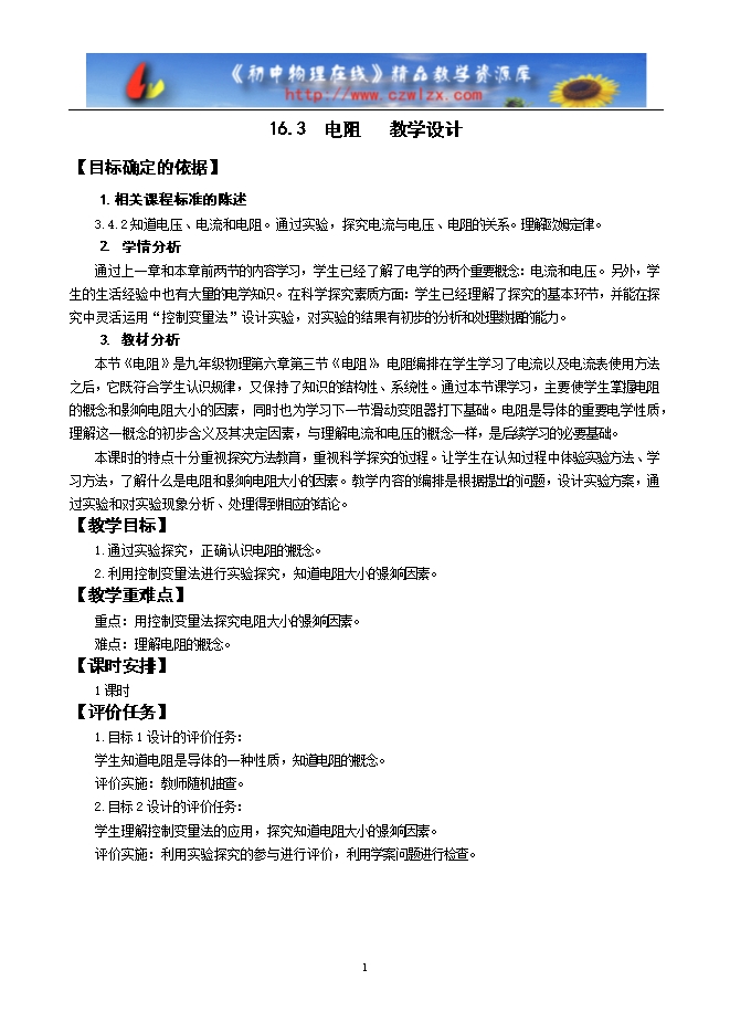 【内容简介】【目标确定的依据】1.相关课程标准的陈述3.4.2知道电压、电流和电阻。通过实验,探究电流与电压、电阻的关系。理解欧姆定律。2. 学情分析通过上一章和本章前两节的内容学习,学生已经了解了电学的两个重要概念:电流和电压。另外,学生的生活经验中也有大量的电学知识。在科学探究素质方面:学生已经理解了探究的基本环节,并能在探究中灵活运用“控制变量法”设计实验,对实验的结果有初步的分析和处理数据的能力。3.教材分析本节《电阻》是九年级物理第六章第三节《电阻》,电阻编排在学生学习了电流以及电流表使用方法之后,它既符合学生认识规律,又保持了知识的结构性、系统性。通过本节课学习,主要使学生掌握电阻的概念和影响电阻大小的因素,同时也为学习下一节滑动变阻器打下基础。电阻是导体的重要电学性质,理解这一概念的初步含义及其决定因素,与理解电流和电压的概念一样,是后续学习的必要基础。本课时的特点十分重视探究方法教育,重视科学探究的过程。让学生在认知过程中体验实验方法、学习方法,了解什么是电阻和影响电阻大小的因素。教学内容的编排是根据提出的问题,设计实验方案,通过实验和对实验现象分析、处理得到相应的结论。【教学目标】1.通过实验探究,正确认识电阻的概念。2.利用控制变量法进行实验探究,知道电阻大小的影响因素。