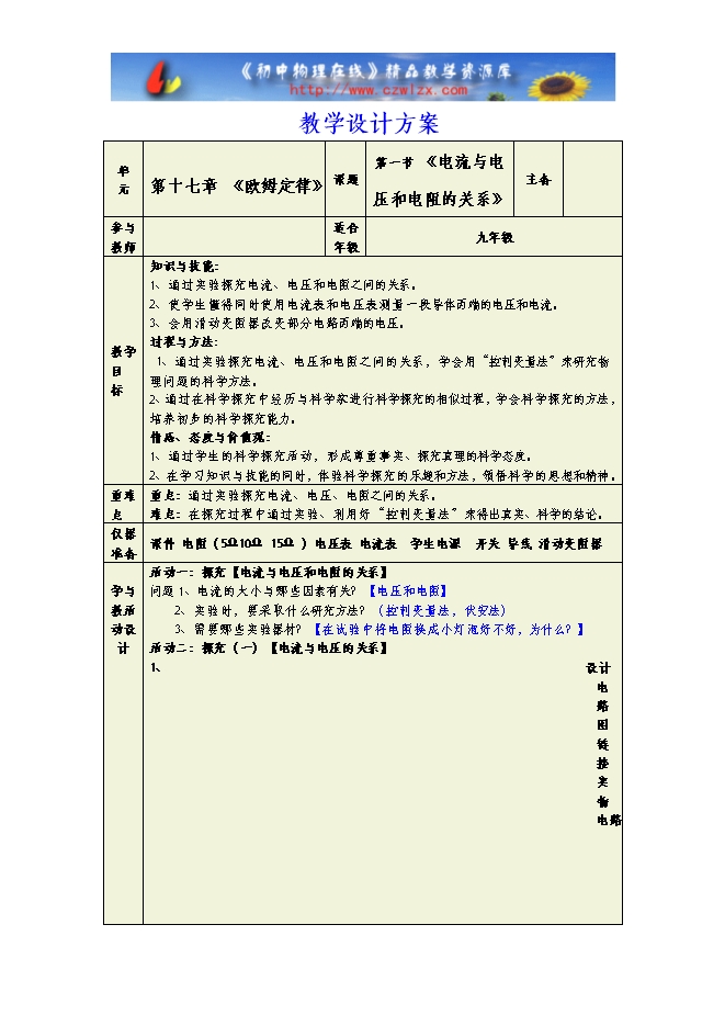 【内容简介】知识与技能: 1、通过实验探究电流、电压和电阻之间的关系。 2、使学生懂得同时使用电流表和电压表测量一段导体两端的电压和电流。 3、会用滑动变阻器改变部分电路两端的电压。 过程与方法: 1、通过实验探究电流、电压和电阻之间的关系,学会用“控制变量法”来研究物理问题的科学方法。 2、通过在科学探究中经历与科学家进行科学探究的相似过程,学会科学探究的方法,培养初步的科学探究能力。 情感、态度与价值观: 1、通过学生的科学探究活动,形成尊重事实、探究真理的科学态度。 2、在学习知识与技能的同时,体验科学探究的乐趣和方法,领悟科学的思想和精神。 重点:通过实验探究电流、电压、电阻之间的关系。 难点:在探究过程中通过实验、利用好“控制变量法”来得出真实、科学的结论。