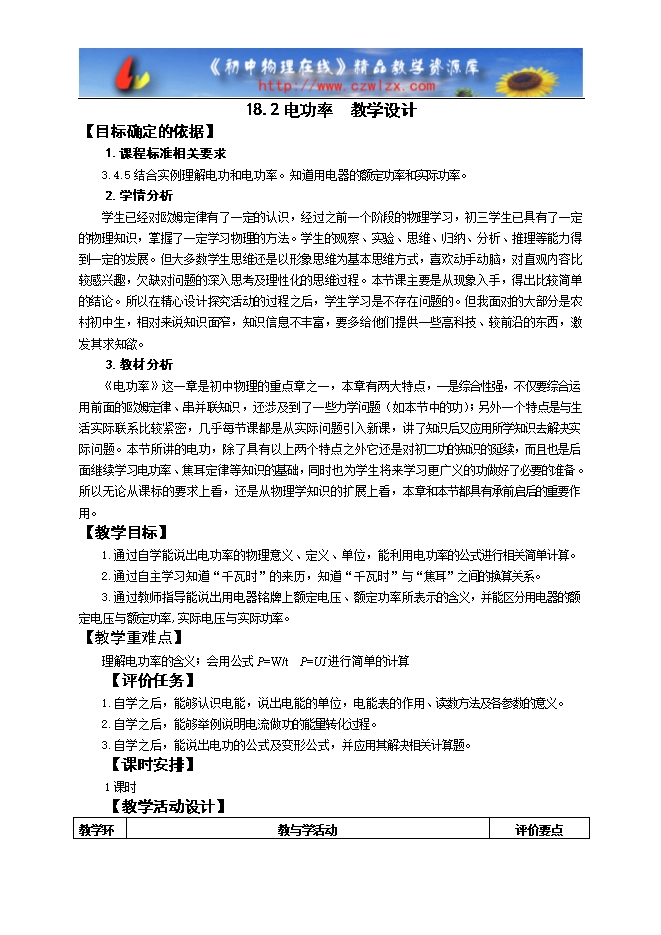 2019-2020学年度人教版九年级全册教学设计:18.2《电功率》(一)