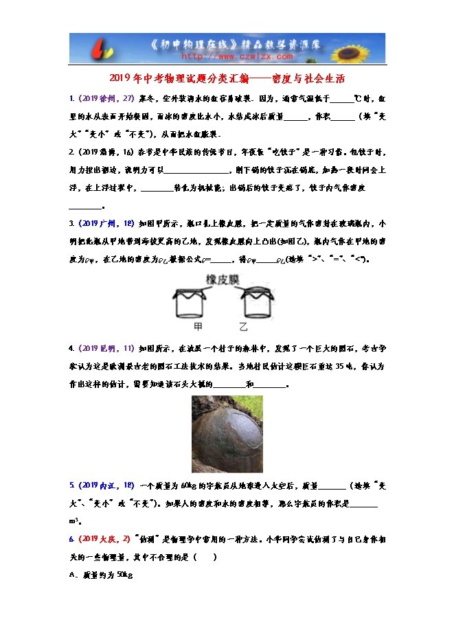 下载地址1|sj/2019/10/2019101110486.doc<p style="line-height:150%"><strong><span style=";line-height:150%;font-family:华文仿宋;color:blue">1.</span></strong><strong><span style=";line-height:150%;font-family:华文仿宋;color:#7030A0">(2019徐州,27)</span></strong><strong><span style=";line-height:150%;font-family:华文仿宋">寒冬,室外装满水的缸容易破裂.因为,通常气温低于<span style="text-decoration:underline;"> </span>℃时,缸里的水从表面开始凝固,而冰的密度比水小,水结成冰后质量<span style="text-decoration:underline;"> </span>,体积<span style="text-decoration:underline;"> </span>(填“变大”“变小”或“不变”),从而把水缸胀裂.</span></strong></p><p style="line-height: 150%;vertical-align: middle"><strong><span style="line-height: 150%;font-family: 华文仿宋">2.</span></strong><strong><span style="line-height: 150%;font-family: 华文仿宋">(2019淄博,16)春节是中华民族的传统节日,年夜饭“吃饺子”是一种习俗。包饺子时,用力捏出褶边,说明力可以________________,刚下锅的饺子沉在锅底,加热一段时间会上浮,在上浮过程中,________转化为机械能;出锅后的饺子变瘪了,饺子内气体密度________。</span></strong></p><p style="line-height: 150%;vertical-align: middle"><strong><span style="line-height: 150%;font-family: 华文仿宋">3.</span></strong><strong><span style=";line-height:150%;font-family:华文仿宋;color:blue">(2019广州,18)</span></strong><strong><span style="line-height: 150%;font-family: 华文仿宋">如图甲所示,瓶口扎上橡皮膜,把一定质量的气体密封在玻璃瓶内,小明把此瓶从甲地带到海拔更高的乙地,发现橡皮膜向上凸出(如图乙),瓶内气体在甲地的密度为<em>ρ</em><sub>甲</sub>,在乙地的密度为<em>ρ</em><sub>乙</sub>.根据公式<em>ρ</em>=_____,得<em>ρ</em><sub>甲</sub>_____<em>ρ</em><sub>乙</sub>(选填“>”、“=”、“<")。</span></strong></p><p style="text-align:center;line-height:150%;vertical-align:middle"><strong><span style="font-family:华文仿宋"><img width="201" height="110" src="http://www.czwlzx.com/UEditor/themes/default/images/spacer.gif" style="background:url(http://www.czwlzx.com/UEditor/lang/zh-cn/images/localimage.png) no-repeat center center;border:1px solid #ddd" /></span></strong></p><p style="line-height: 150%;vertical-align: middle"><strong><span style="line-height: 150%;font-family: 华文仿宋">4.</span></strong><strong><span style=";line-height:150%;font-family:华文仿宋;color:#7030A0">(2019昆明,11)</span></strong><strong><span style="line-height: 150%;font-family: 华文仿宋">如图所示,在波黒一个村子的森林中,发现了一个巨大的圆石,考古学家认为这是欧洲最古老的圆石工法技术的结果。当地村民估计这颗巨石重达35吨,你认为作出这样的估计,需要知道该石头大概的________和________。</span></strong></p><p><br /></p>不限不限试题试卷免费doc