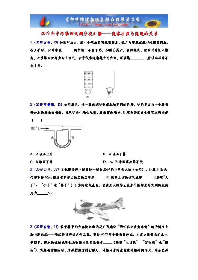 【内容简介】3.(2019贵港,11)位于桂平的大藤峡水电站是广西建设“西江亿吨黄金水道”的关键节点和打造珠江——西江经济带标志性工程,预计2023年全部项目建成。在庞大而复杂的水电枢纽中,将水的机械能转化为电能的主要设备是_____(选填“电动机” “发电机”或“船闸”);货船通过船闸后,若两艘船并排行驶时,两船间水的流速比两船外侧的大,这会使两 船“相吸”甚至发生碰撞,这是因为液体在流速大的地方_____。5.(2019淮安,17)为了测定风速大小,小明设计了如图所示的装置。装置中探头、金属杆和滑动变阻器滑片P 相连。可上下移动。该装置利用了流体流速越大,压强越________的原理。现要求:当风吹过探头时。风速越大,电压表的示数越大,请对该装置提出一条合理的改进措施_______ .