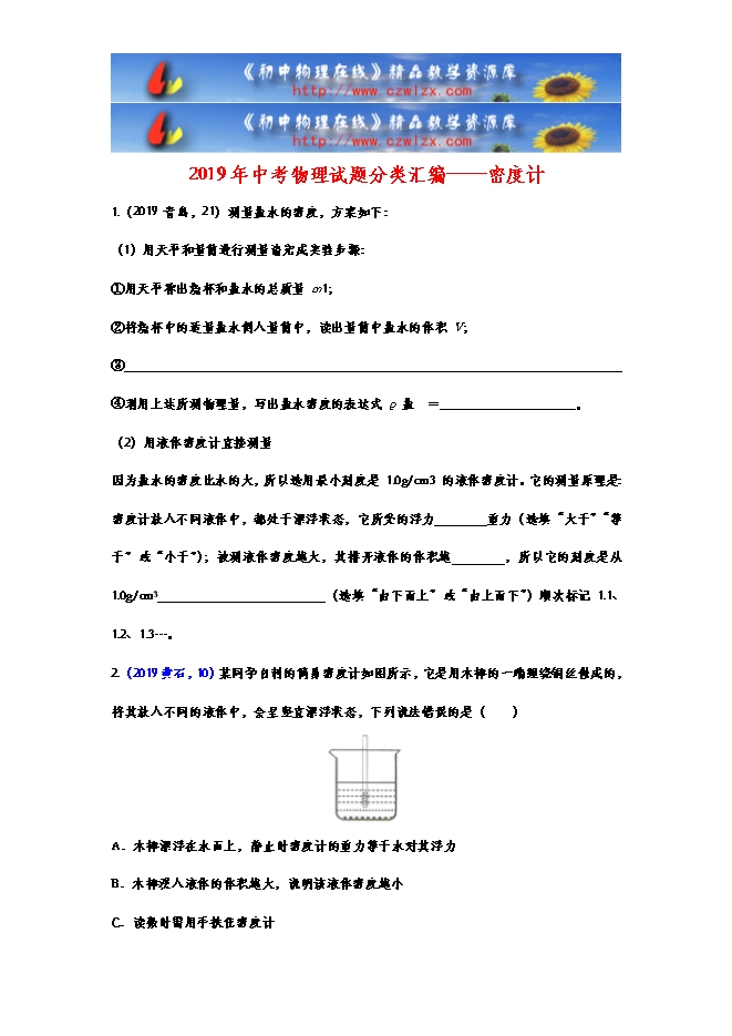 【内容简介】1.(2019 青岛,21)测量盐水的密度,方案如下: (1)用天平和量筒进行测量请完成实验步骤:①用天平称出烧杯和盐水的总质量 m1;②将烧杯中的适量盐水倒入量筒中,读出量筒中盐水的体积 V;③ ④利用上述所测物理量,写出盐水密度的表达式 ρ 盐 = 。(2)用液体密度计直接测量因为盐水的密度比水的大,所以选用最小刻度是 1.0g/cm3 的液体密度计。它的测量原理是:密度计放入不同液体中,都处于漂浮状态,它所受的浮力 重力(选填“大于”“等于”或“小于”);被测液体密度越大,其排开液体的体积越 ,所以它的刻度是从 1.0g/cm3 (选填“由下而上”或“由上而下”)顺次标记 1.1、1.2、1.3…。2.(2019黄石,10)某同学自制的简易密度计如图所示,它是用木棒的一端缠绕铜丝做成的,将其放入不同的液体中,会呈竖直漂浮状态,下列说法错误的是( )
