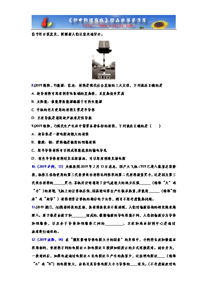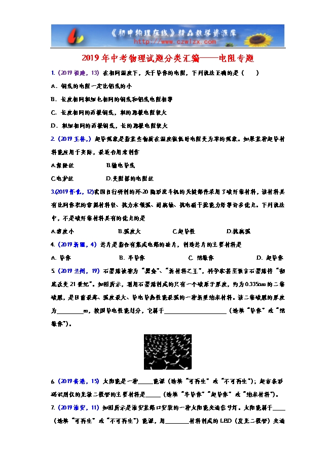 【内容简介】1.(2019福建,13)在相同温度下,关于导体的电阻,下列说法正确的是( )A.铜线的电阻一定比铝线的小 B.长度相同粗细也相同的铜线和铝线电阻相等 C.长度相同的两根铜线,粗的那根电阻较大 D.粗细相同的两根铜线,长的那根电阻较大2.(2019玉林,)超导现象是指某些物质在温度很低时电阻变为零的现象。如果某种超导材料能应用于实际,最适合用来制作A.保险丝 B.输电导线C.电炉丝 D.变阻器的电阻丝3.(2019怀化,12)我国自行研制的歼-20隐形战斗机的关键部件采用了碳纤维材料,该材料具有比同体积的常规材料轻、抗力本领强、耐腐蚀、抗电磁干扰能力好等许多优点。下列说法中,不是碳纤维材料具有的优点的是A.密度小 B.强度大 C.超导性 D.抗腐强4.(2019新疆,4)芯片是指含有集成电路的硅片,制造芯片的主要材料是A. 导体 B. 半导体 C. 绝缘体 D. 超导体5.(2019兰州,19)石墨烯被称为“黑金”、“新材料之王”,科学家甚至预言石墨烯将“彻底改变21世纪”。如图所示,利用石墨烯制成的只有一个碳原子厚度,约为0.335nm的二维碳膜,是目前最薄、强度最大、导电导热性能最强的一种新型纳米材料。该二维碳膜的厚度为 m,按照导电性能划分,它属于 (选填“导体”或“绝缘体”)。