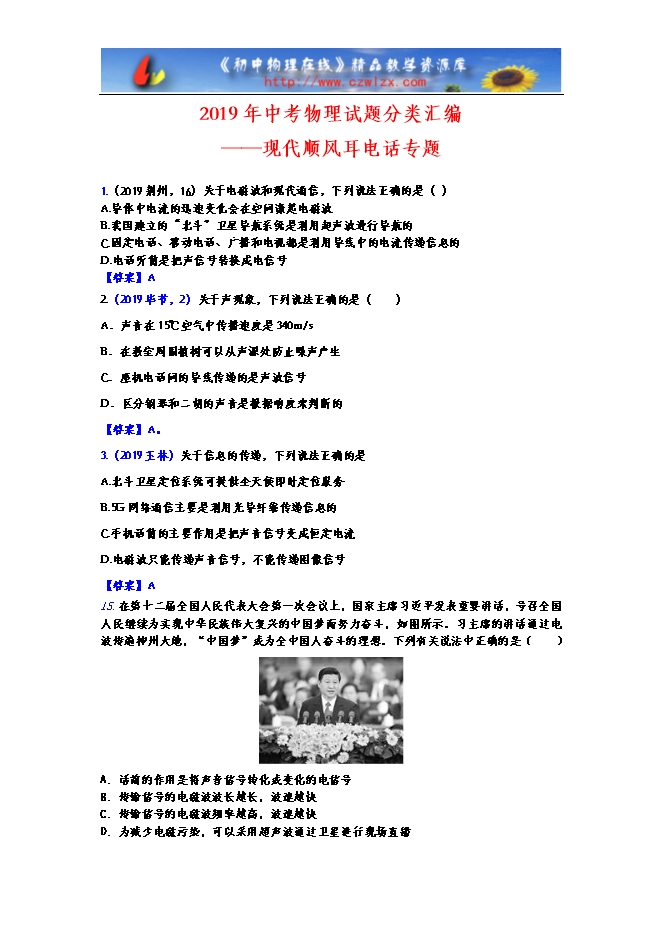 2019年中考物理试题分类汇编(五)——64现代顺风耳--电话专题(word版含答案)