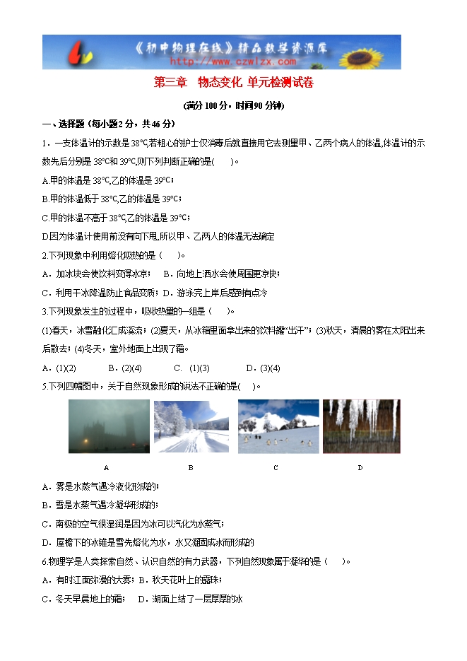 【内容简介】一、选择题(每小题2分,共46分)1.一支体温计的示数是38℃,若粗心的护士仅消毒后就直接用它去测量甲、乙两个病人的体温,体温计的示数先后分别是38℃和39℃,则下列判断正确的是( )。A.甲的体温是38℃,乙的体温是39℃;B.甲的体温低于38℃,乙的体温是39℃;C.甲的体温不高于38℃,乙的体温是39℃;D.因为体温计使用前没有向下甩,所以甲、乙两人的体温无法确定2.下列现象中利用熔化吸热的是( )。A.加冰块会使饮料变得冰凉; B.向地上洒水会使周围更凉快;C.利用干冰降温防止食品变质;D.游泳完上岸后感到有点冷3.下列现象发生的过程中,吸收热量的一组是( )。(1)春天,冰雪融化汇成溪流;(2)夏天,从冰箱里面拿出来的饮料罐“出汗”;(3)秋天,清晨的雾在太阳出来后散去;(4)冬天,室外地面上出现了霜。A.(1)(2) B.(2)(4) C. (1)(3) D.(3)(4)