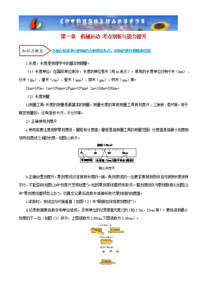 【内容简介】全面介绍本单元的知识点和常见考点,对知识进行提炼和总结1.长度:长度是物理学中的基本物理量。(1)长度单位:在国际单位制中,长度的单位是米(用m表示)。常用的长度单位还有千米(km)、分米(dm)、厘米(cm)、毫米(mm)、微米(μm)、纳米(nm)等。1km=103m,1m=103mm=106μm=109nm;1m=10dm=100cm。(2)长度测量1)测量工具:长度的测量是最基本的测量。测量长度的常用测量工具有刻度尺、三角板、卷尺等。用于精密测量的,还有游标卡尺、千分尺等。2)正确使用刻度尺a.使用前要注意观察零刻度线、量程和分度值。量程是指测量工具的测量范围;分度值是指最小刻度相邻两刻度线之间的长度,如图(1)所示。图(1)刻度尺b.正确放置刻度尺。零刻度线对准被测长度的一端,有刻度线的一边要紧靠被测物体且与被测长度保持平行,不能歪斜(如图(2)中“刻度尺怎样放置”);如因零刻度线磨损而取另一整刻度线作为零刻度线时(如图(2)中“零刻度线磨损怎么办”),切莫忘记最后读数中减掉所取代零刻线的刻度值。c.读数时,视线应与尺面垂直(如图(2)中“眼睛如何观察刻度线”)。d.记录数据要由数字和单位组成,没有单位的记录是毫无意义的(如1.5m、35cm等);要估读到最小刻度的下一位(如图(3)所示,上图读数为3.80cm,下图读数为3.38cm)。