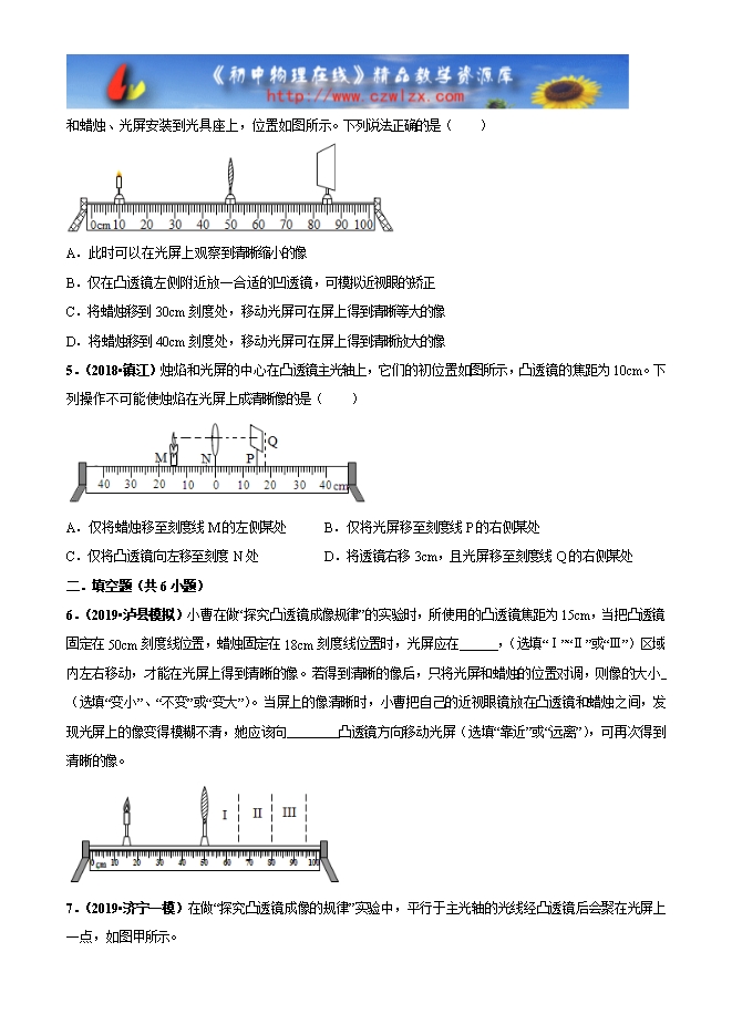 【内容简介】一.选择题(共5小题)1.(2019•徐州)在“探究凸透镜成像规律”时,开始时烛焰在光屏上成缩小的像,接着把物距调整为刚才的一半,移动光屏使烛焰在光屏上成像,此时的像( )A.是放大的 B.是缩小的 C.是等大的 D.以上三种都有可能2.(2019•武昌区一模)某物理实验小组的同学对光学实验很感兴趣,他们用如图的器材做实验,先用焦距为20cm的透镜甲进行实验,在屏上能得到了清晰的缩小实像:接下来他们想改用焦距为10cm的透镜乙继续进行实验,如果不改变蜡烛和凸透镜的位置,又要在光屏上成清晰的像,则实验小组的同学对此问题以及实验有关问题的讨论,不正确的是( )A.应该将光屏向右移动,得到了清晰的放大实像B.应该将光屏向左移动,得到了仍是清晰的缩小实像C.实验中所用的透镜成像原理是光的折射 D.实验中所用的光屏最好是白色,所用的蜡烛换成带有“F”形的LED灯会更好3.(2019•鄂州)在做“探究凸透镜成像规律”的实验中,某小组同学利用图甲测出了透镜的焦距后,正确安装并调节实验装置如图乙所示,在光屏上得到一个清晰的像。下列说法正确的是( )