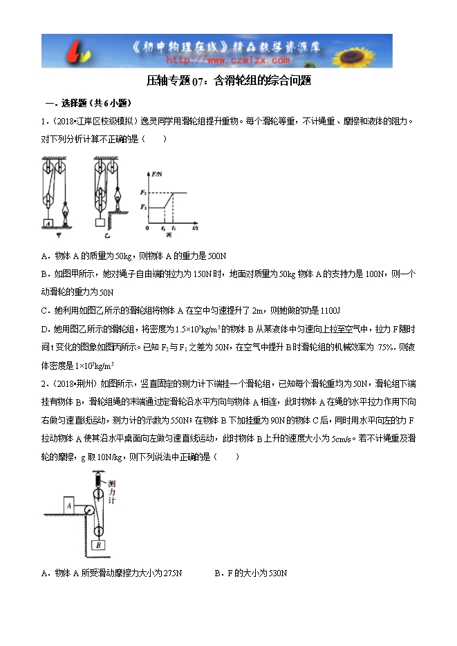 【内容简介】 一.选择题(共6小题)1.(2018•江岸区校级模拟)逸灵同学用滑轮组提升重物。每个滑轮等重,不计绳重、摩擦和液体的阻力。对下列分析计算不正确的是( )A.物体A的质量为50kg,则物体A的重力是500N B.如图甲所示,她对绳子自由端的拉力为150N时,地面对质量为50kg物体A的支持力是100N,则一个动滑轮的重力为50N C.她利用如图乙所示的滑轮组将物体A在空中匀速提升了2m,则她做的功是1100JD.她用图乙所示的滑轮组,将密度为1.5×103kg/m3的物体B从某液体中匀速向上拉至空气中,拉力F随时间t变化的图象如图丙所示。已知F2与F1之差为50N,在空气中提升B时滑轮组的机械效率为 75%.则液体密度是1×103kg/m32.(2018•荆州)如图所示,竖直固定的测力计下端挂一个滑轮组,已知每个滑轮重均为50N,滑轮组下端挂有物体B,滑轮组绳的末端通过定滑轮沿水平方向与物体A相连,此时物体A在绳的水平拉力作用下向右做匀速直线运动,测力计的示数为550N;在物体B下加挂重为90N的物体C后,同时用水平向左的力F拉动物体A使其沿水平桌面向左做匀速直线运动,此时物体B上升的速度大小为5cm/s。若不计绳重及滑轮的摩擦,g取10N/kg,则下列说法中正确的是( )
