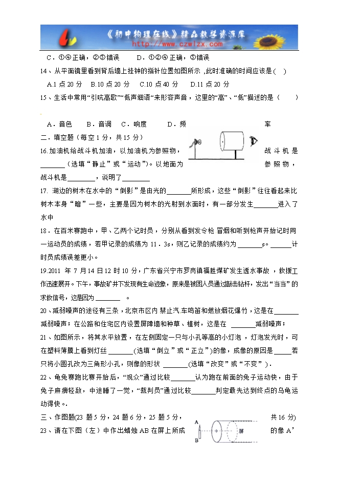 【内容简介】一.选择题(每题2分,共30分)1.观察身边的物理现象——下列估测最接近实际的是( )A.演奏中华人民共和国国歌所需的时间约为50h B.我们所用物理教材的宽度约为25mmC.我们班跑的最快的同学速度能达到20km/hD.声音在真空中的传播速度是340 m/s[来源:学科网ZXXK]2. 天坛公园内的回音壁是我国建筑史上的一大奇迹,它的声学原理是( )A.声音的反射 B.声音能在空气中传播 C.声音在墙壁内传播 D.利用回声加强原声3. 从匀速直线运动的速度公式 v = s/ t得出的结论,正确的是( )A.速度与路程成正比 B.速度与时间成反比C.速度不变,路程与时间成正比 D.速度与路程成反比4、甲乙两物体做匀速直线运动,如果甲乙速度之比为4:3,通过的路程之比为5:2,则甲乙所用时间之比为( )A、10:3 B、3:10 C、8:15 D、15:8