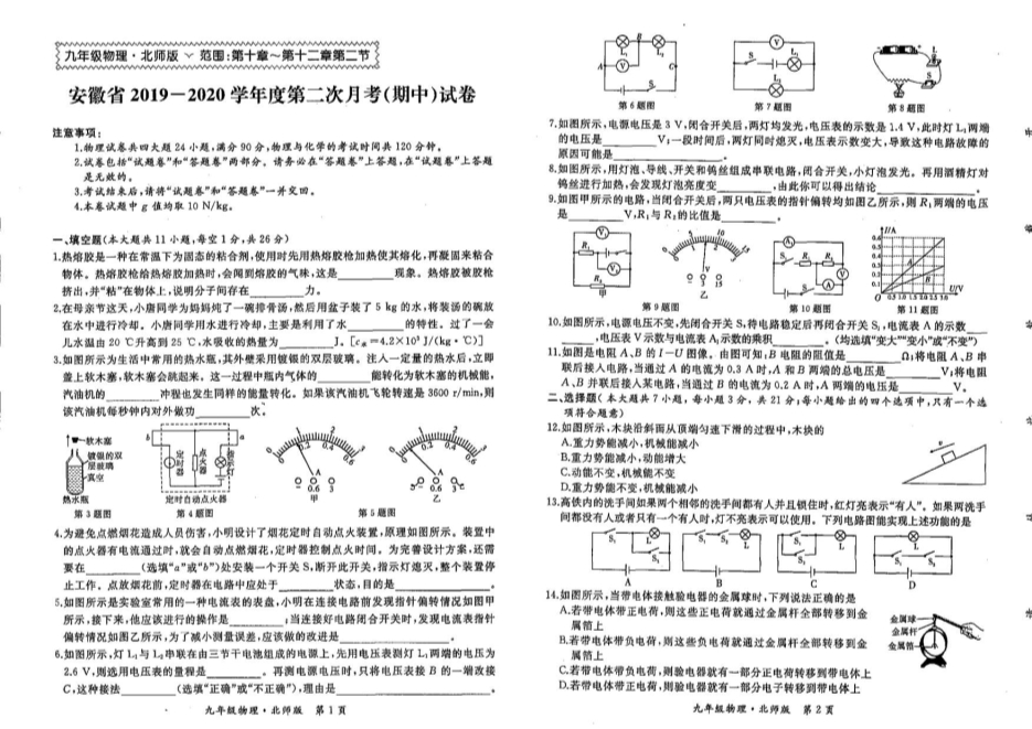 安徽省2019-2020学年第一学期第二次月考期中考试九年级物理试卷(PDF版无答案)