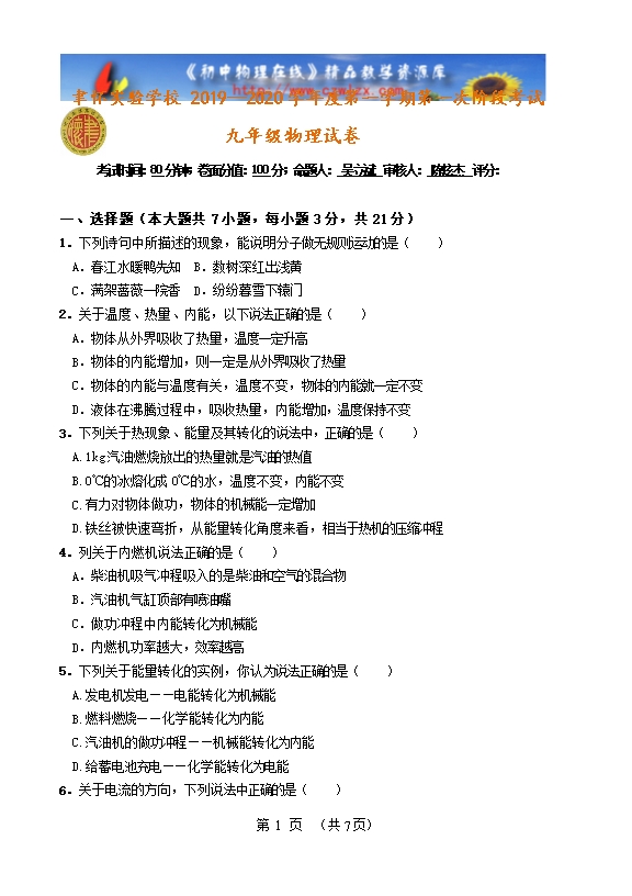 【内容简介】2019-2020学年第一学期广东省汕头聿怀实验学校第一阶段考试物理试卷(无答案)