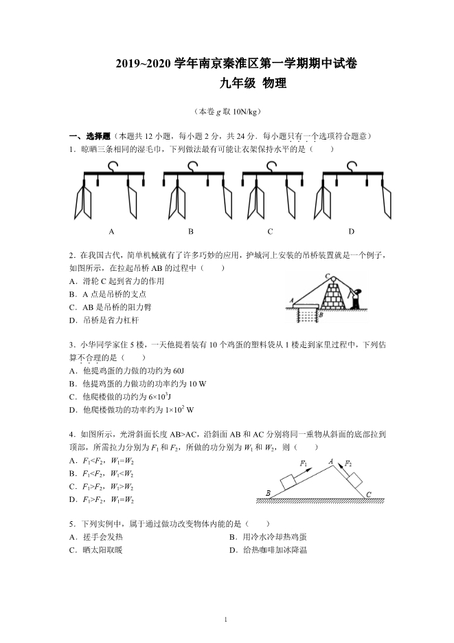 【内容简介】江苏省南京秦淮区2019-2020学年第一学期九上期中物理试卷及部分解析(pdf版)