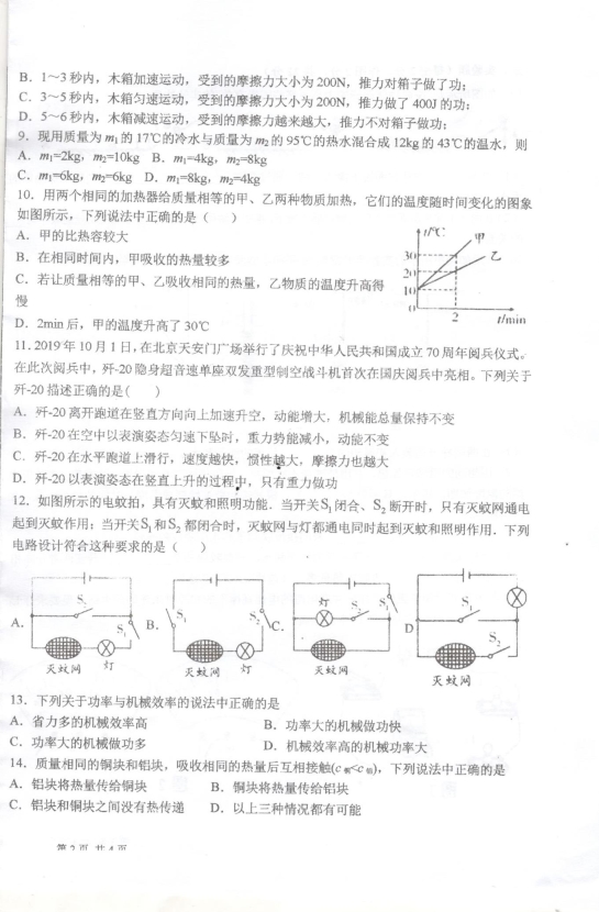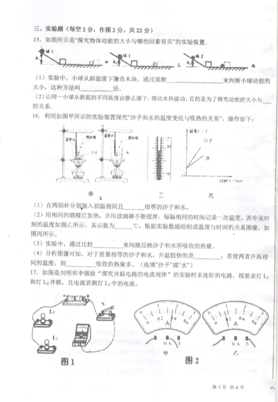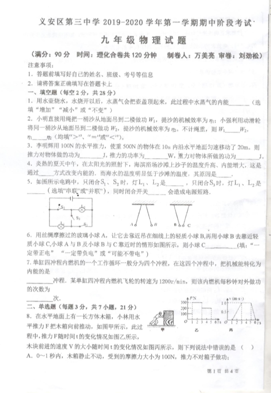 铜陵市义安区2019-2020学年第一学期九年级期中考试物理试卷(扫描版)