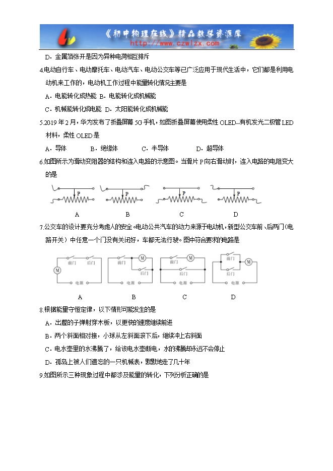 山东省无棣县2020届九年级上学期期中学业检测物理试题及答案