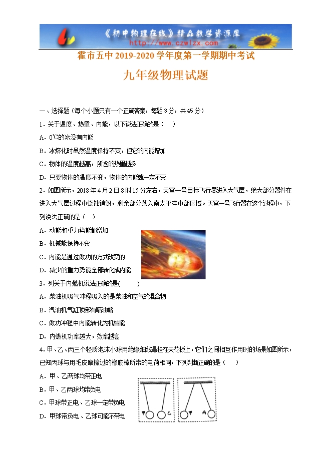 所属专辑: 各地2019-2020学年九年级上学期期中考试物理试题汇总
