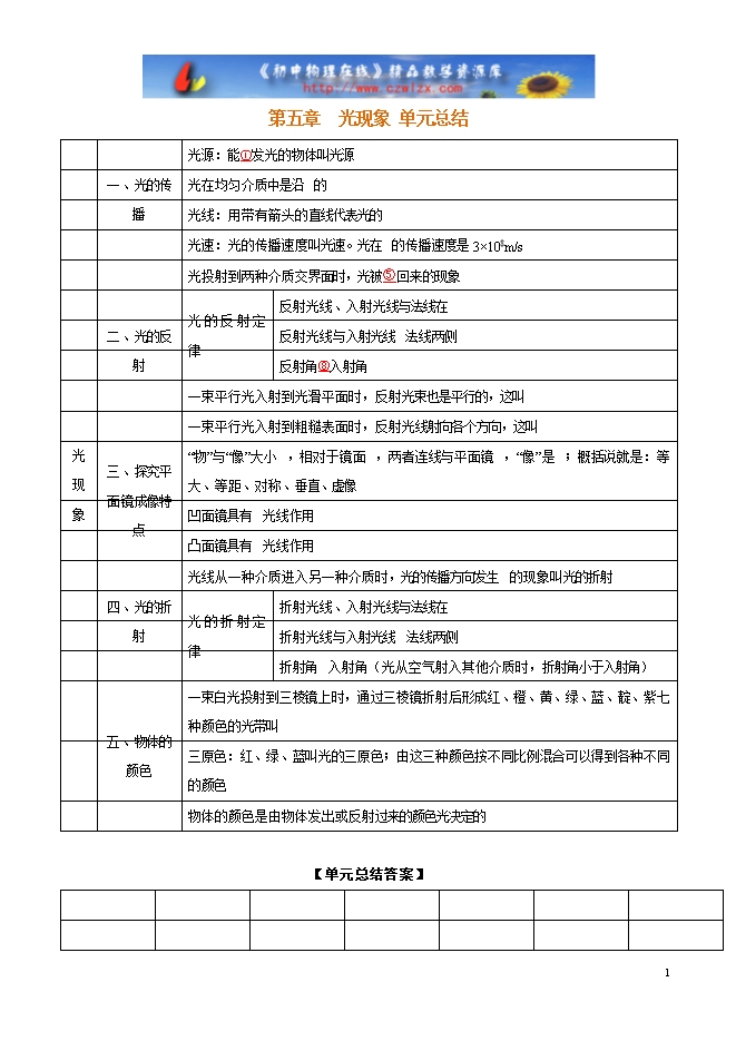 【精品】2019-2020学年北师大版八年级物理同步课堂:第五章 光现象(单元总结 单元测试)
