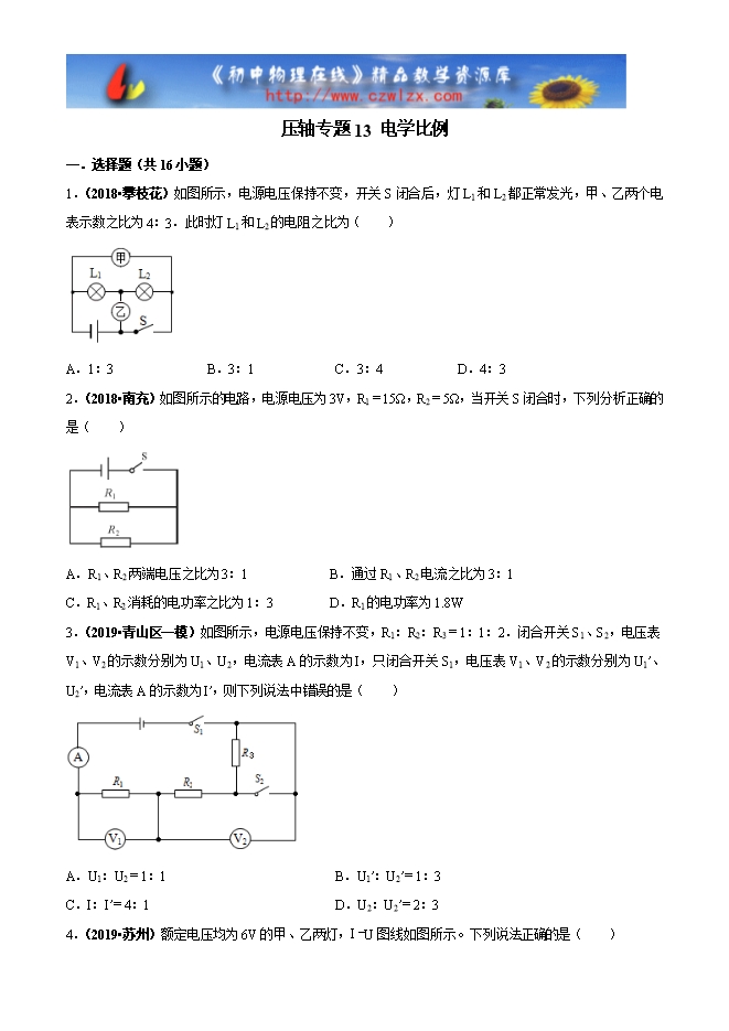 2020届九年级物理培优压轴题专练专题:13 电学比例