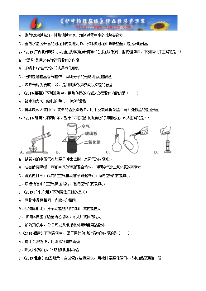 2019-2020学年九年级全一册物理精讲精练(人教版):专题13.2 内能(原卷版和解析版)