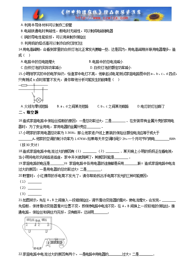 【内容简介】人教版九年级物理全册:19.2“家庭电路电流过大的原因”竞赛辅导练习题(无答案)