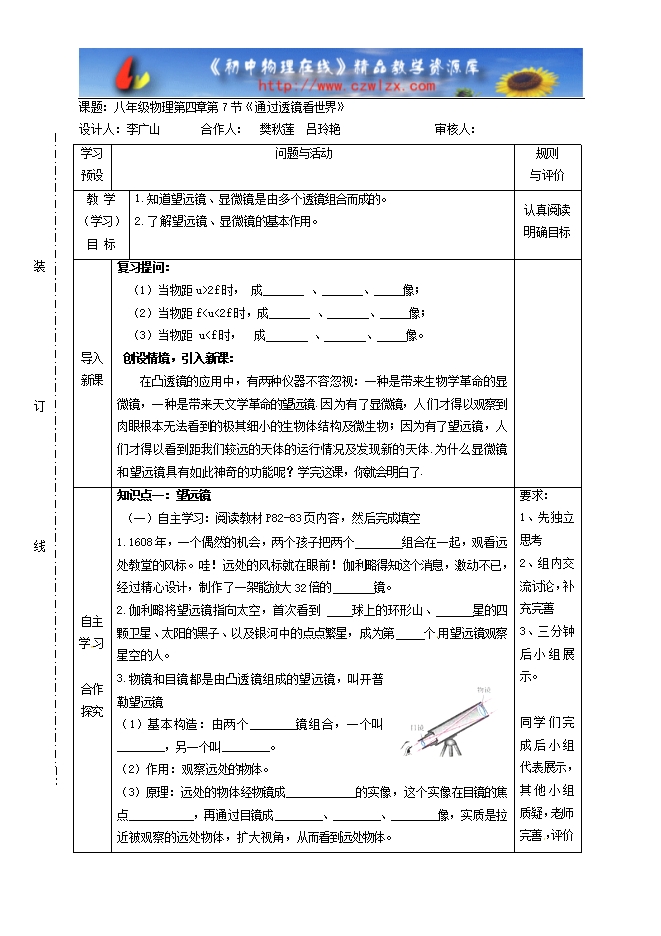 教科版八年级物理上册学案:第四章 第7节《通过透镜看世界》(含答案)