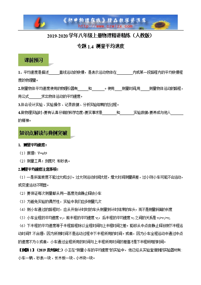 (人教版)2019-2020学年八年级上册物理精讲精练:专题1.4 测量平均速度