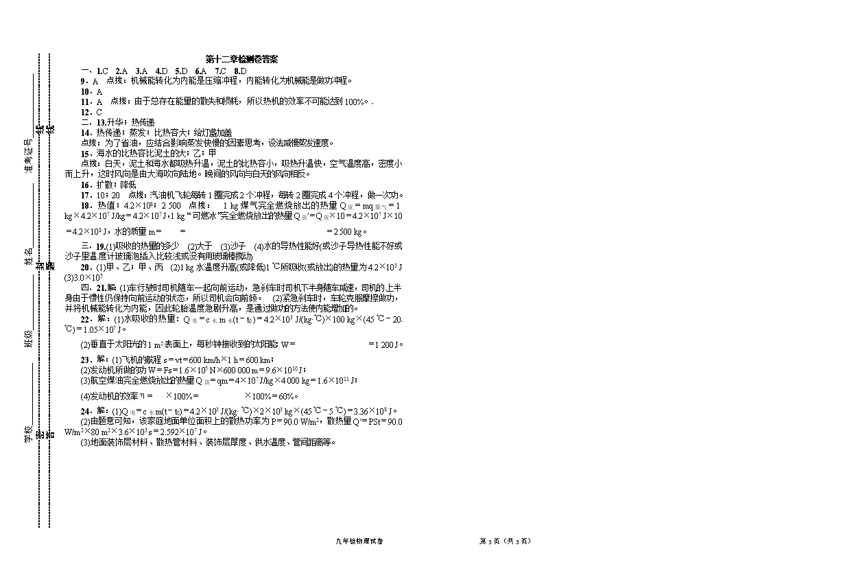 (沪粤版)2019-2020学年度第一学期物理九年级《第十二章 内能与热机》检测卷及答案