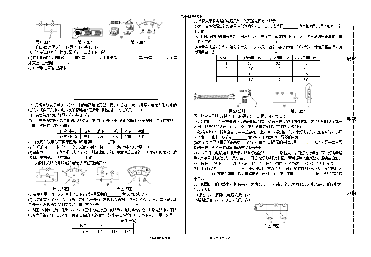 【内容简介】一、选择题(每题3分,共36分)1.人类对原子结构的认识始于对静电现象的研究,下列有关说法中正确的是( )A.摩擦起电创造了电荷 B.自然界只存在正、负两种电荷C.同种电荷相吸引,异种电荷相排斥 D.从静电现象认识到原子核是可分的2.如图所示,一带负电橡胶棒靠近用细线挂住的轻细吸管A端时,吸管发生了转动。对吸管A端带电性质判断正确的是( ) 第2题图 第7题图 第8题图 第9题图A.若相互吸引,一定带正电 B.若相互吸引,一定带负电C.若相互排斥,一定带正电 D.若相互排斥,一定带负电3.现代人的生活已经离不开电了,为了安全用电,我们对生活中一些“电”的常识的了解必不可少。下列有关常见电压值的表述,错误的是( )A.一节新干电池的电压是1.5 V B.家庭电路的电压是220 VC.手机电池电压大约是3.7 V D.对人体安全的电压是36 V4.汽车在转向前,司机会拨动方向盘旁边的横杆,汽车同侧的前后两个转向灯就会同时闪亮、同时熄灭,司机所拨动的这根横杆就相当于电路中的( )A.电源 B.开关 C.导线 D.用电器5.如图所示电路中,开关能同时控制两盏灯,若一盏灯的灯丝断了,不影响另一盏灯的工作的电路是( )6.教室内有四盏灯,两个开关,每个开关控制两盏灯。图中能正确反映教室这四盏灯连接情况的是( )7.如图是玩具汽车的电路图,以下有关说法中正确的是( )A.开关S1控制整个电路 B.开关S2控制电动机