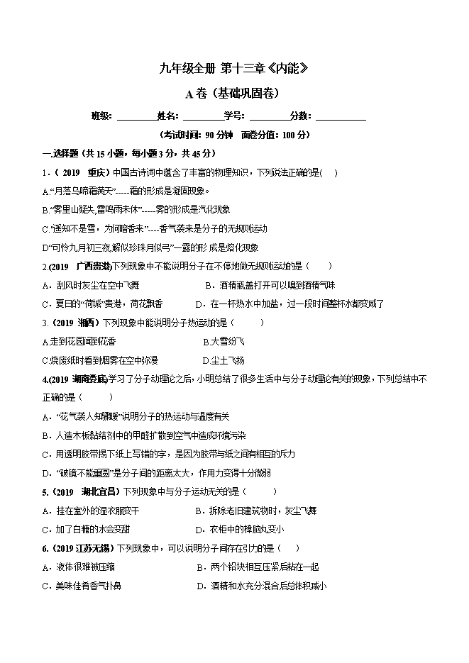【内容简介】一.选择题(共15小题,每小题3分,共45分)1.( 2019 重庆)中国古诗词中蕴含了丰富的物理知识,下列说法正确的是( )A.“月落乌啼霜满天”-----霜的形成是凝固现象。 B.“雾里山疑失,雷鸣雨未休”-----雾的形成是汽化现象 C."遥知不是雪,为何暗香来”----香气袭来是分子的无规则运动D“可怜九月初三夜,解似珍珠月似弓”一露的形 成是熔化现象2.(2019 广西贵港)下列现象中不能说明分子在不停地做无规则运动的是( )A.刮风时灰尘在空中飞舞 B.酒精瓶盖打开可以嗅到酒精气味C.夏日的“荷城”贵港,荷花飘香 D.在一杯热水中加盐,过一段时间整杯水都变咸了3.(2019 湘西)下列现象中能说明分子热运动的是( )A.走到花园闻到花香 B.大雪纷飞C.烧废纸时看到烟雾在空中弥漫 D.尘土飞扬4.(2019 湖南娄底)学习了分子动理论之后,小明总结了很多生活中与分子动理论有关的现象,下列总结中不正确的是( )A.“花气袭人知骤暖”说明分子的热运动与温度有关B.人造木板黏结剂中的甲醛扩散到空气中造成环境污染C.用透明胶带揭下纸上写错的字,是因为胶带与纸之间有相互的斥力D.“破镜不能重圆”是分子间的距离太大,作用力变得十分微弱5.(2019 湖北宜昌)下列现象中与分子运动无关的是( )A.挂在室外的湿衣服变干 B.拆除老旧建筑物时,灰尘飞舞 C.加了白糖的水会变甜 D.衣柜中的樟脑丸变小6.(2019江苏无锡)下列现象中,可以说明分子间存在引力的是( )A.液体很难被压缩 B.两个铅块相互压紧后粘在一起C.美味佳肴香气扑鼻 D.酒精和水充分混合后总体积减小